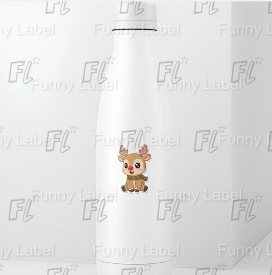 Spread holiday cheer with our adorable Rudolph Reindeer Sticker, featuring a cartoon-style reindeer with a red nose, big eyes, and a cozy green-and-red striped scarf. SIZE:2.0X2.5 inch This festive label...