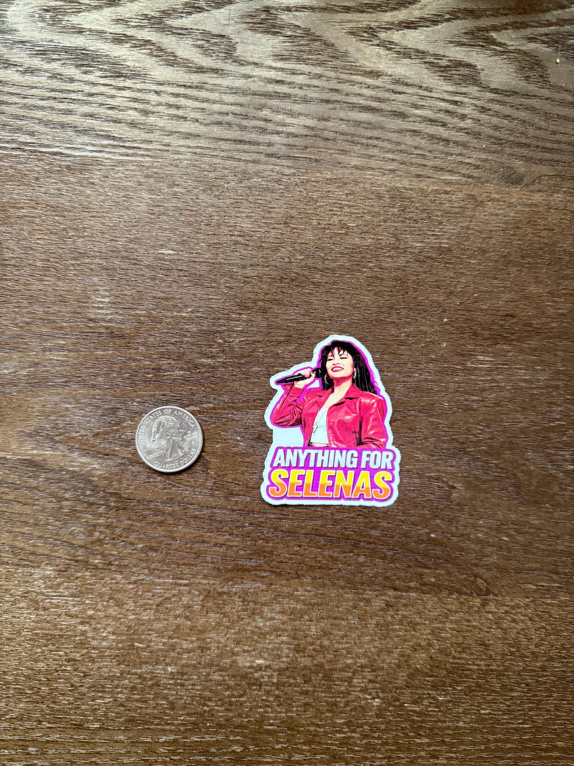This captivating decal features the legendary Selena Quintanilla-Pérez in her recognizable red jacket, holding a microphone and radiating her superstar charm. Below her image is the famous, beloved quote "ANYTHING FOR SELENAS" – a true testament to her enduring legacy and the devotion of her fans. It's the perfect accessory for any Selena enthusiast, Latin music lover, or anyone who appreciates pop culture icons and powerful statements.