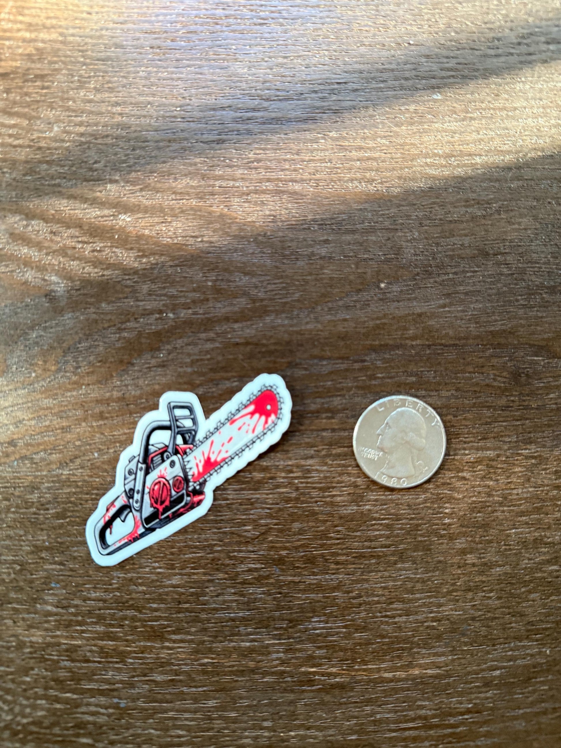 Vibrant & Gruesome Colors: The stark red blood against the grey metal of the chainsaw makes this sticker truly pop with a chilling aesthetic.