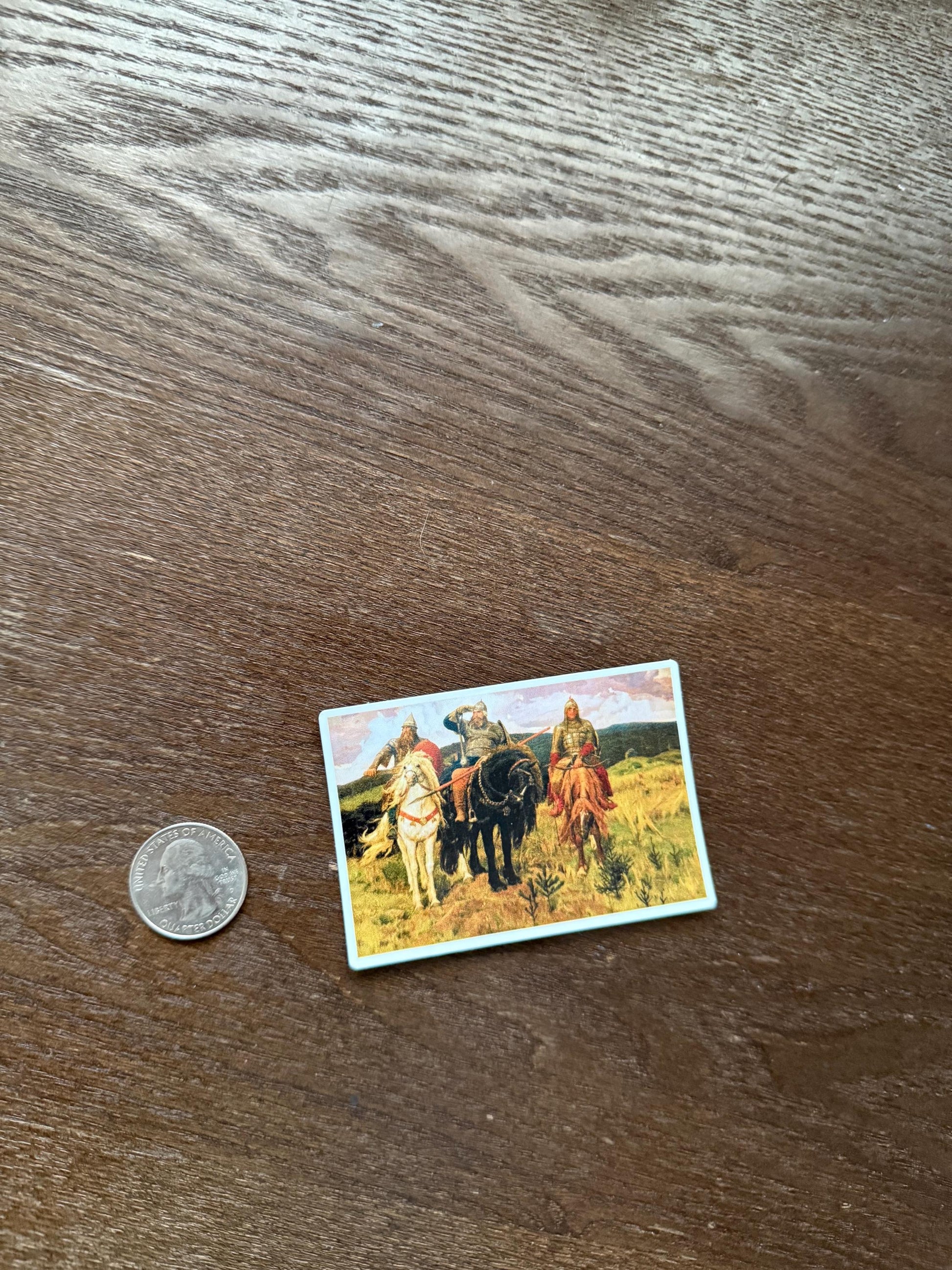 This compelling decal features a detailed print of Viktor Vasnetsov's masterpiece, "Bogatyrs." It depicts the three legendary knights of Kievan Rus' folklore—Ilya Muromets, Dobrynya Nikitich, and Alyosha Popovich—on their powerful horses, standing guard over their land. It's a fascinating piece of art, perfect for collectors, history enthusiasts, art students, fantasy fans, or anyone who appreciates unique historical and cultural context.