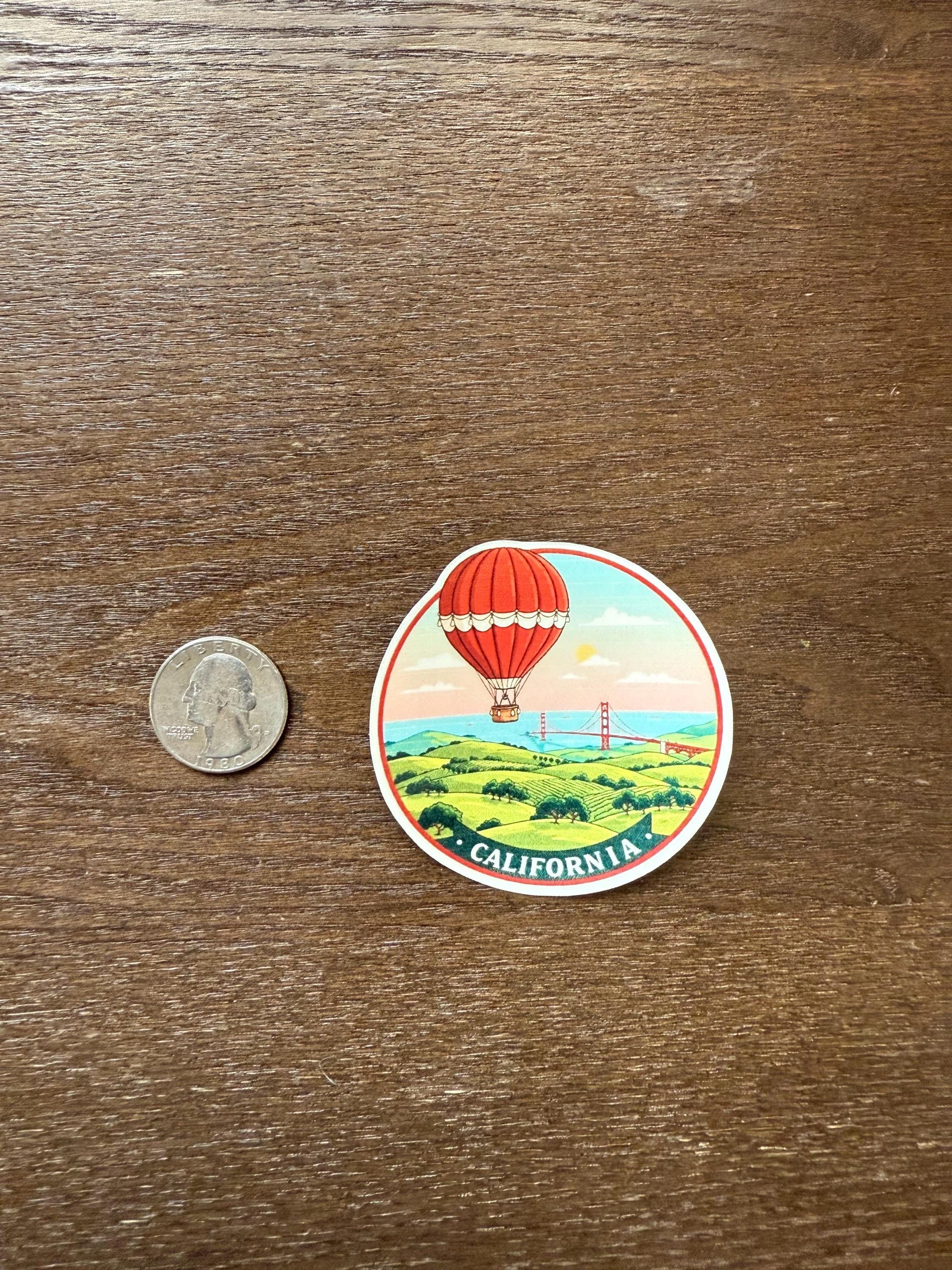This captivating decal features a classic hot air balloon floating above rolling hills, with the iconic Golden Gate Bridge and the ocean in the background. With a clear vintage travel poster aesthetic and the word "CALIFORNIA" at the bottom, it beautifully captures the magic of the state's famous landmarks and scenery. It's the ideal accessory for travelers, San Francisco locals, or anyone who appreciates unique destination art and a bit of California dreaming.