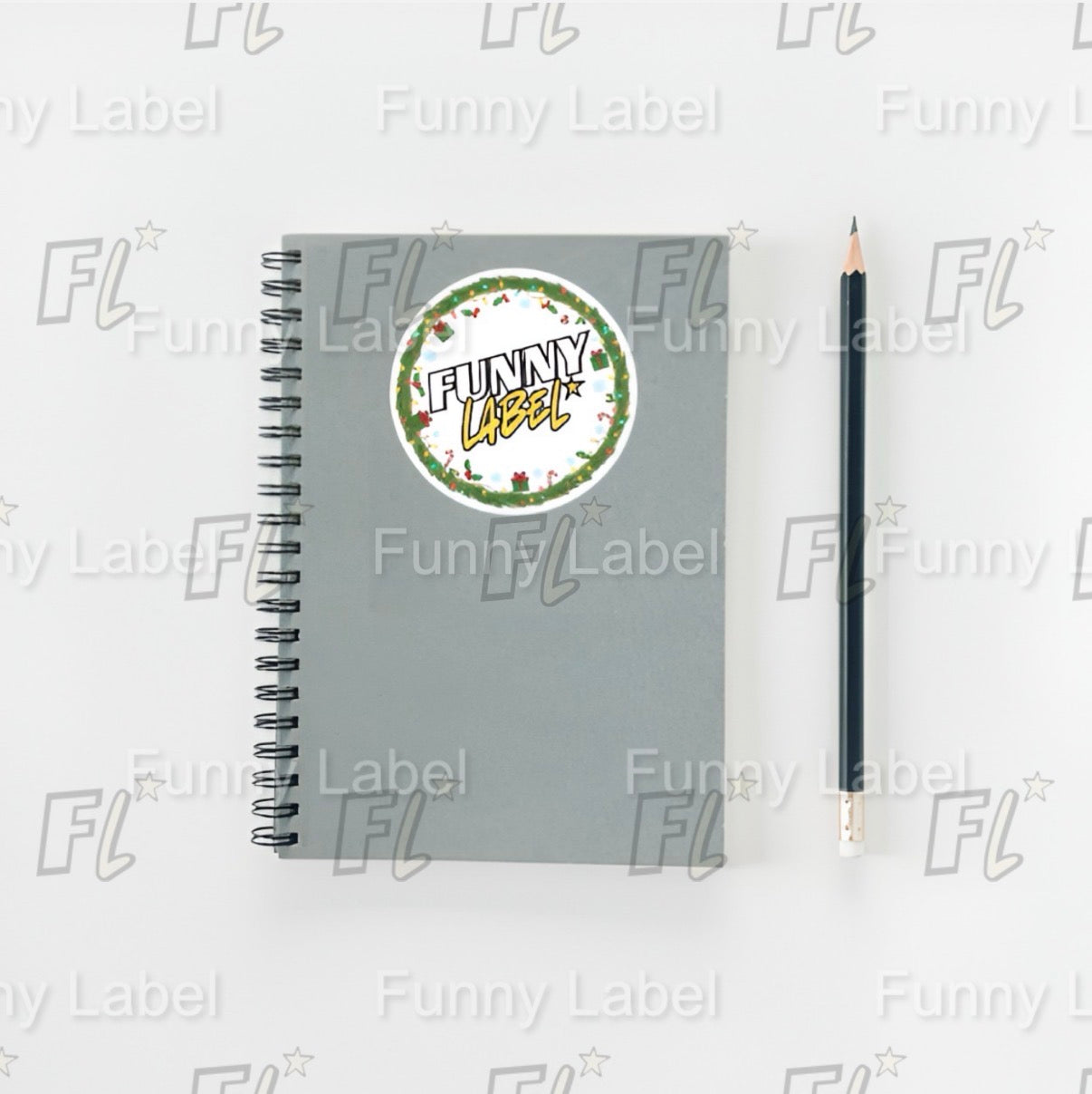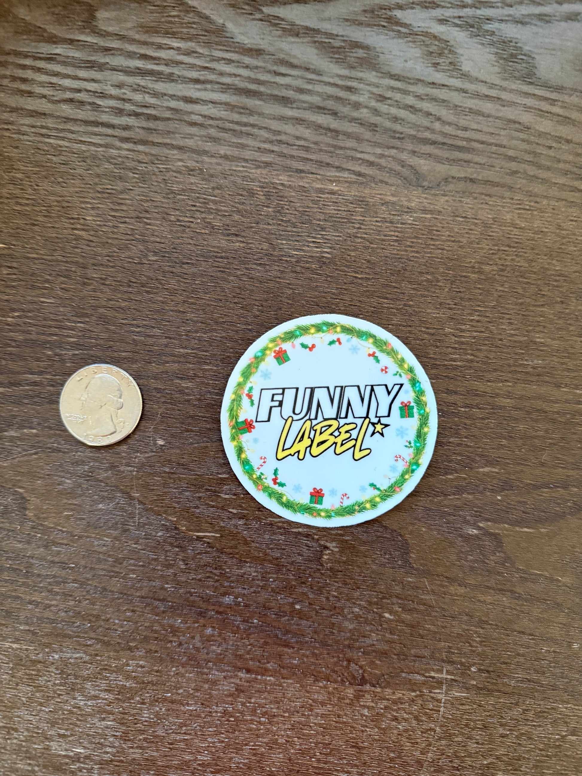 This festive Christmas wreath “Funny Label” sticker adds a cheerful holiday touch to any gift or project. The design features a round evergreen wreath decorated with holly leaves, red ornaments, candy canes, snowflakes, and tiny wrapped presents. The center text reads “Funny Label” in a bold, playful style that stands out beautifully on planners, packaging, notebooks, laptops, water bottles, and more.
