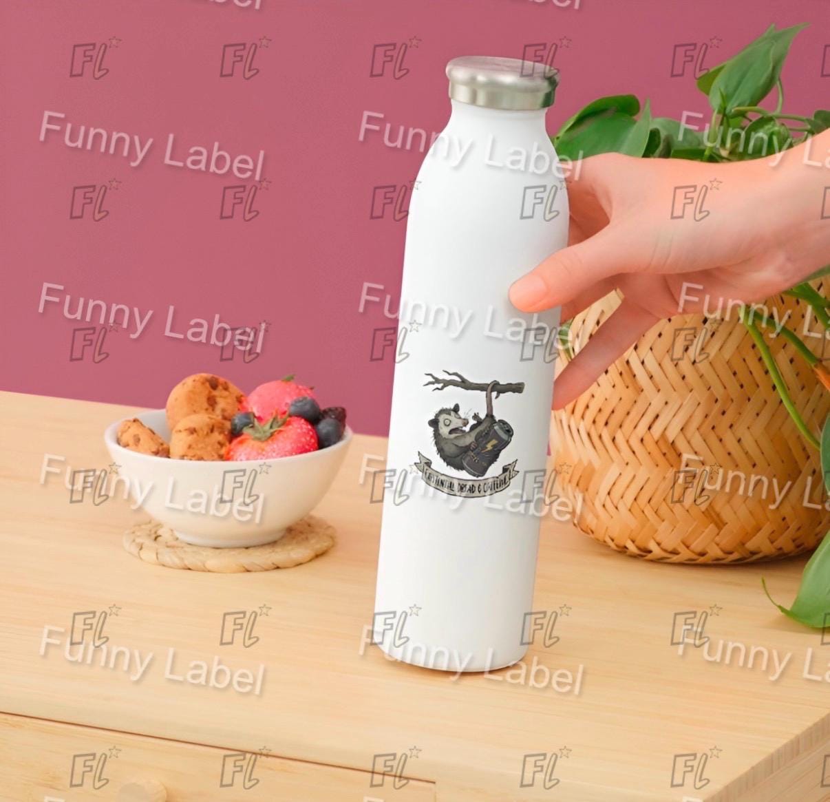 Our "Existential Dread & Caffeine" Sticker captures the ultimate chaotic mood. It features a wide-eyed, stressed opossum hanging from a branch, clinging for dear life to a can of "Hyper-Core" energy drink.