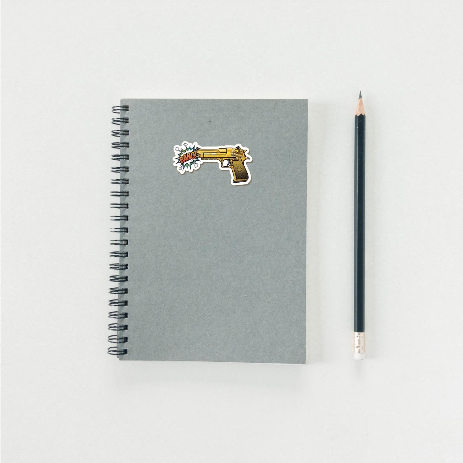 This vibrant decal features a sleek golden handgun, dynamically brought to life with a classic comic book-style "BANG!". It's the perfect accessory for anyone who loves pop art aesthetics, comic book culture, or wants to add a unique, edgy touch to their belongings.