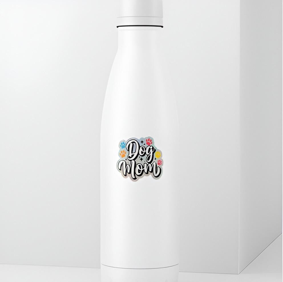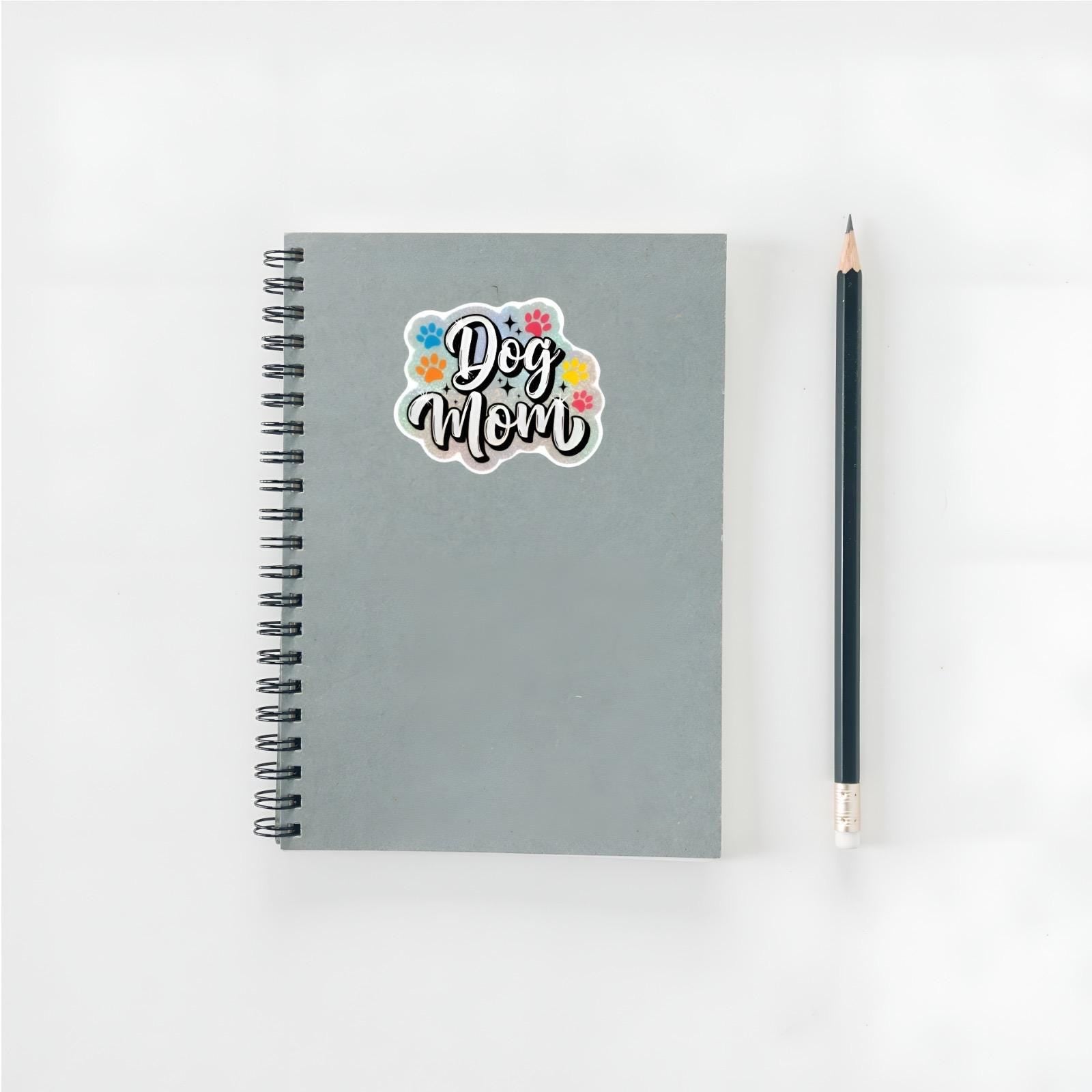 This vibrant and eye-catching decal features the bold "Dog Mom" text in a shimmering holographic effect, surrounded by colorful paw prints that sparkle in the light. It's the perfect accessory for proud dog mothers, pet lovers, or anyone who adores their furry best friend and wants to show it off in style!