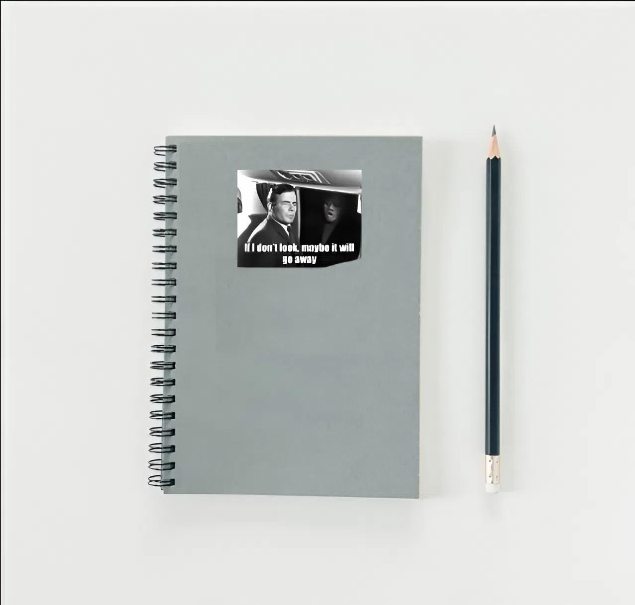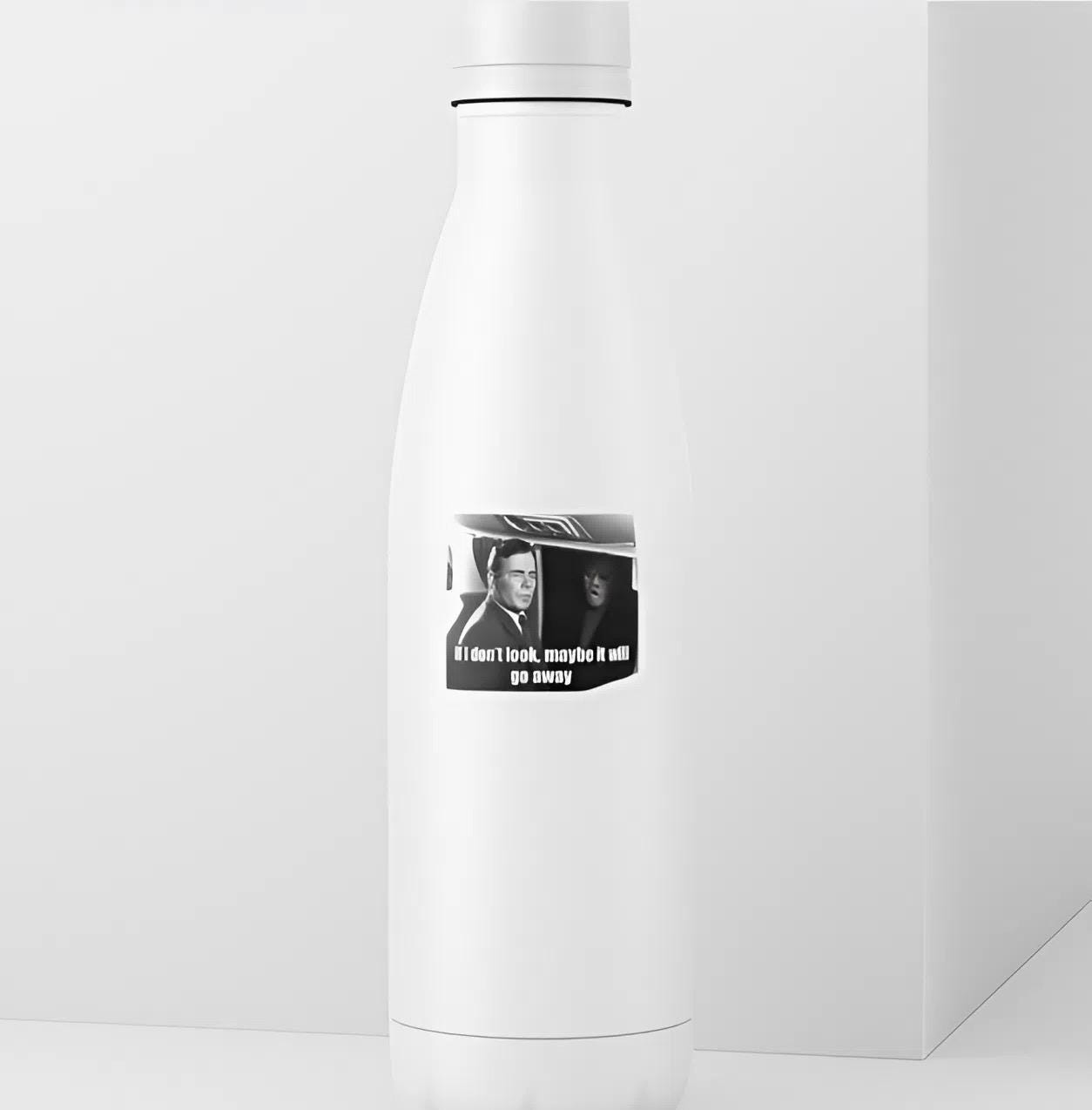 This captivating decal features the iconic black-and-white scene from The Twilight Zone's "Nightmare at 20,000 Feet," with a wide-eyed William Shatner trying to ignore the terrifying gremlin on the wing. Below, the universally relatable quote "If I don't look, maybe it will go away" adds a layer of modern, humorous resignation to a timeless horror classic. It's the perfect accessory for fans of classic television, vintage horror, or anyone who just wants to quietly deal with their problems by pretending they aren't there.