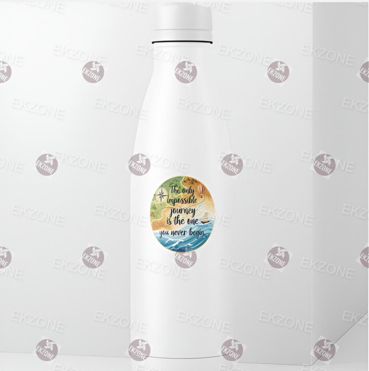This captivating circular decal features a vintage-style world map, complete with a classic sailing ship, a hot air balloon, and a compass rose. The inspiring phrase The only impossible journey is the one you never begin is written across the center, making it the perfect accessory for travelers, dreamers, or anyone who needs a little nudge to embark on their next big adventure.