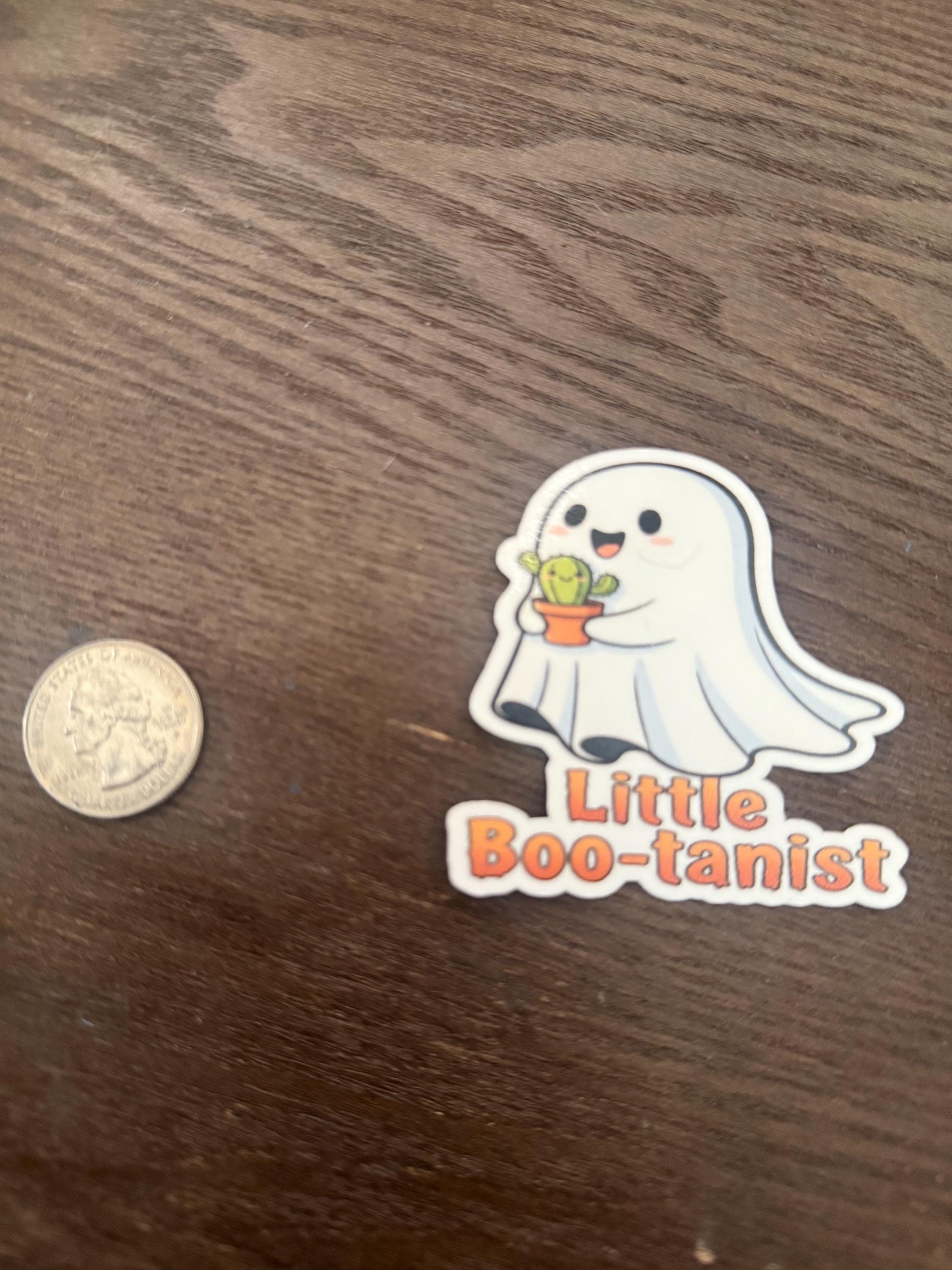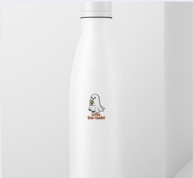 This super cute and clever decal features a happy little ghost lovingly holding a potted cactus, with the delightful pun "Little Boo-tanist" below. It's the perfect accessory for plant parents, succulent enthusiasts, ghost lovers, or anyone who appreciates a good pun and a touch of spooky charm!