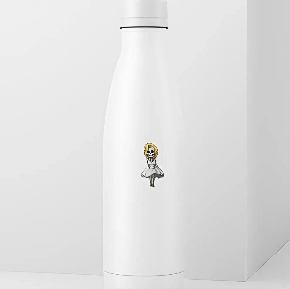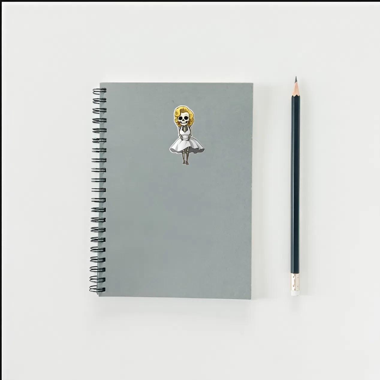 This unique decal features a skeleton version of Marilyn Monroe, complete with her signature blonde curls, white dress, and red earrings, capturing her timeless pose with a macabre edge. It's a clever and artistic blend of classic Hollywood glamor and a spooky aesthetic, perfect for fans of vintage cinema, unique art, or anyone who appreciates a bit of dark humor and iconic figures.