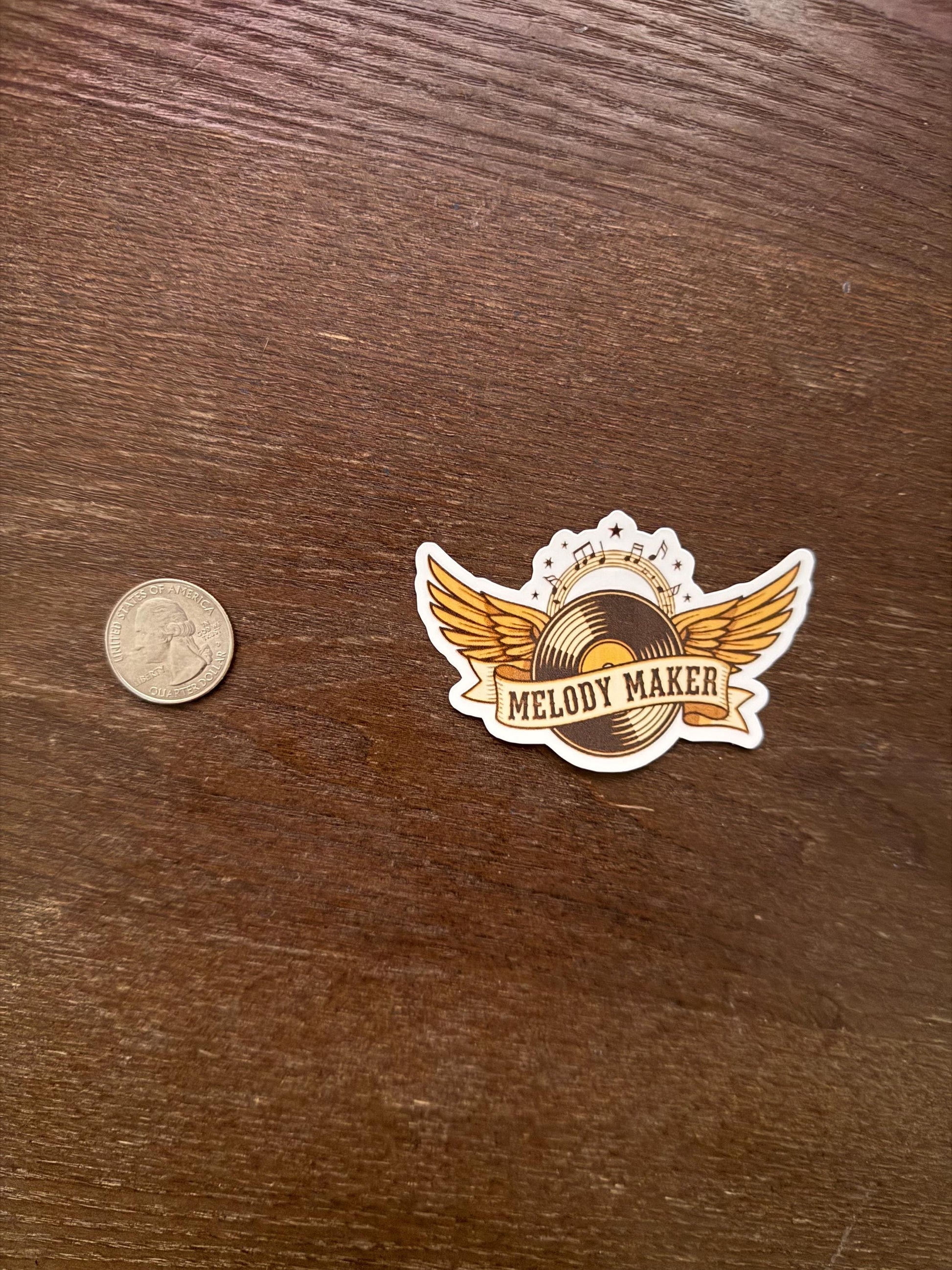 This captivating decal features a classic vinyl record emblem with majestic wings, surrounded by musical notes and stars. The banner across the center proudly proclaims MELODY MAKER, making it the perfect accessory for musicians, producers, DJs, or anyone who deeply connects with the art of creating and appreciating music. It's a timeless design that blends a retro aesthetic with a powerful artistic message.