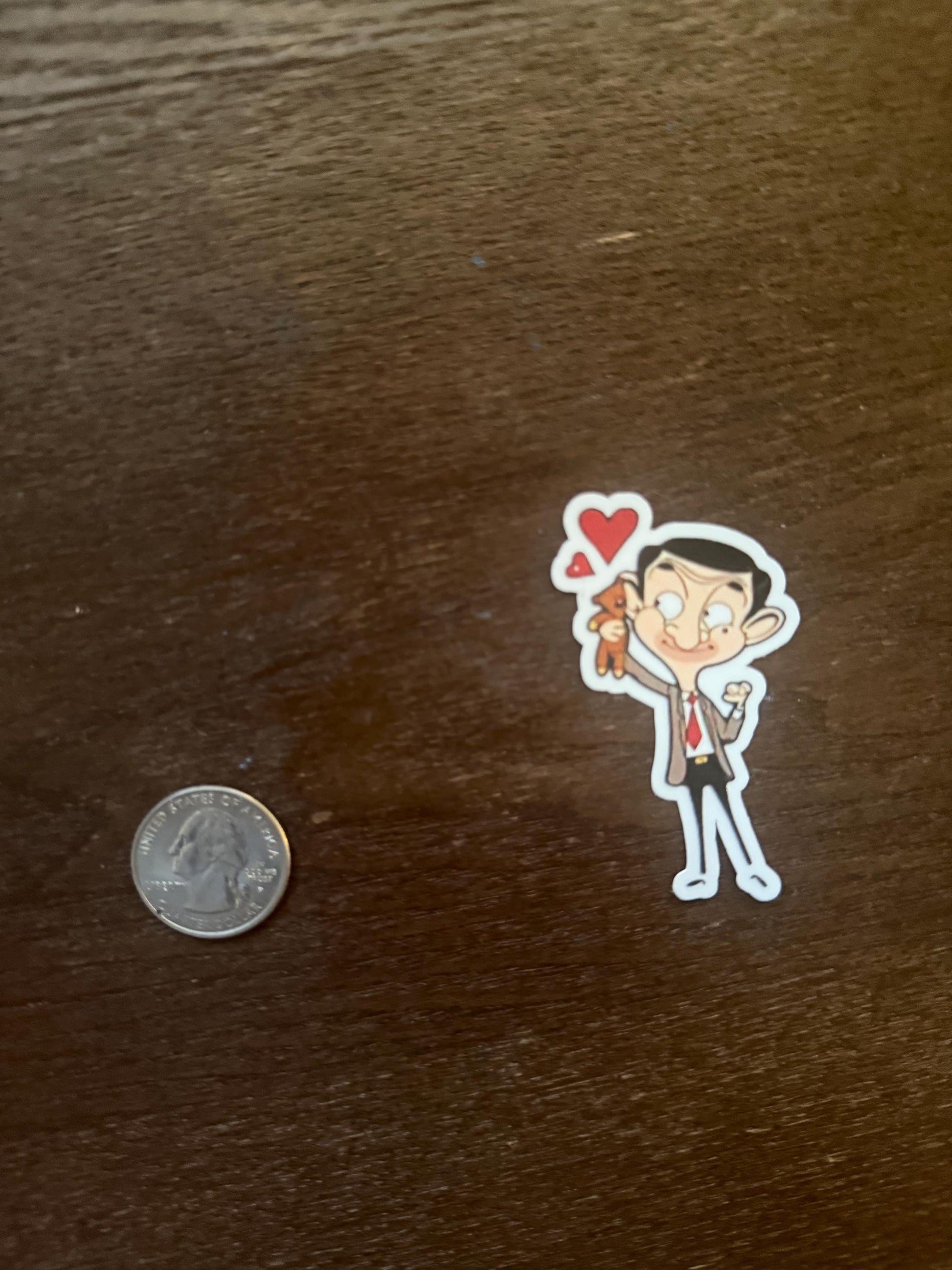 This delightful decal features the iconic Mr. Bean holding his cherished teddy bear, surrounded by playful hearts that perfectly capture his unique blend of awkward charm and genuine affection. It's an instantly recognizable design that will bring a smile to anyone who loves the legendary TV show and its unforgettable characters.