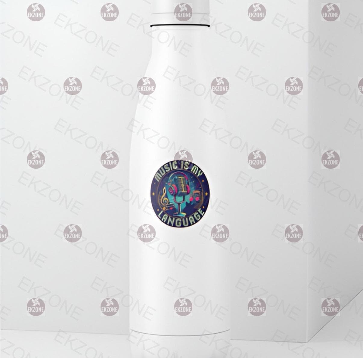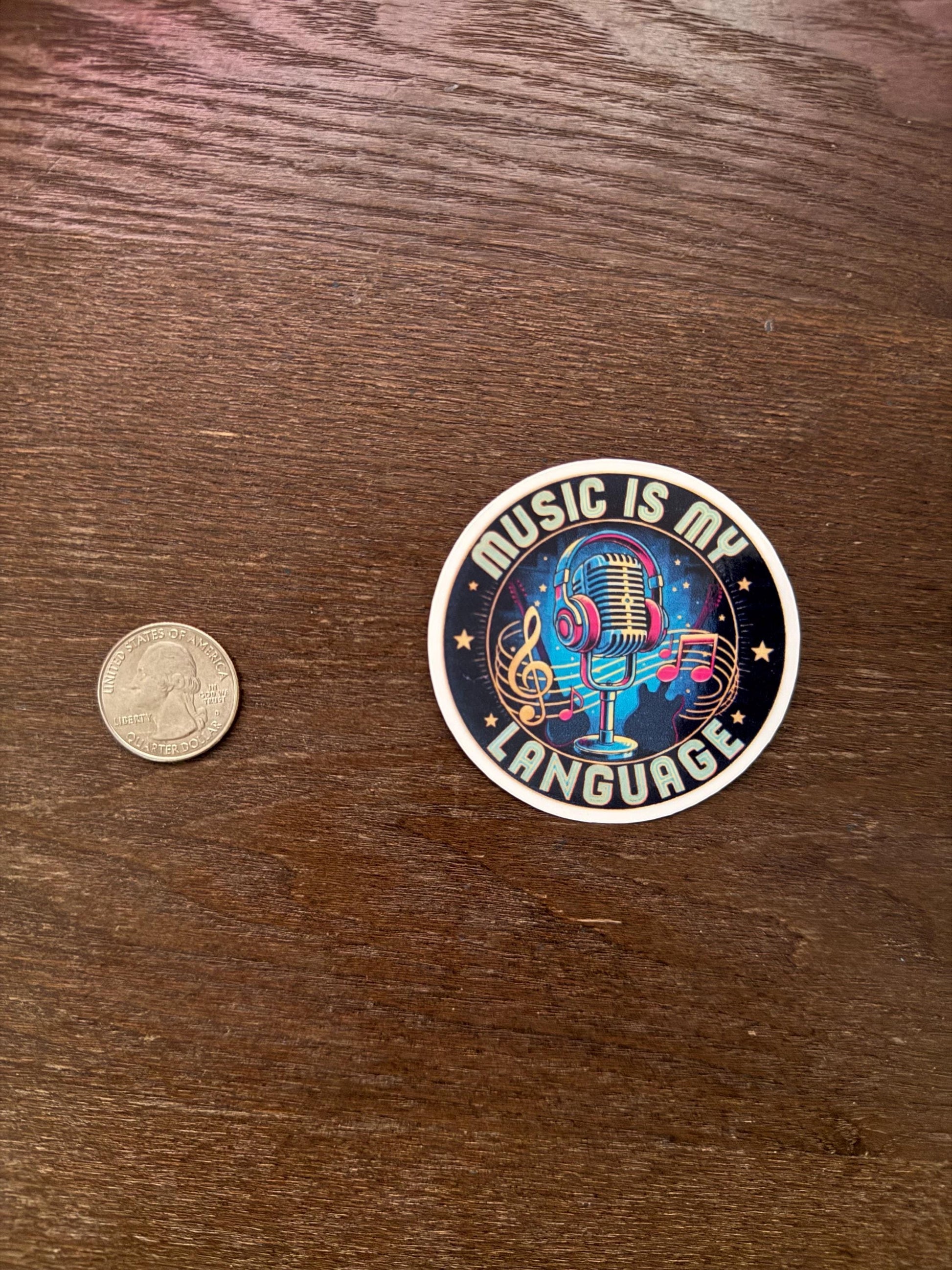 This captivating circular decal features a retro-style microphone and headphones, surrounded by musical notes, stars, and subtle guitars, all under the heartfelt phrase "MUSIC IS MY LANGUAGE." It's the perfect accessory for musicians, DJs, music lovers, or anyone who deeply connects with the emotional and spiritual power of music.