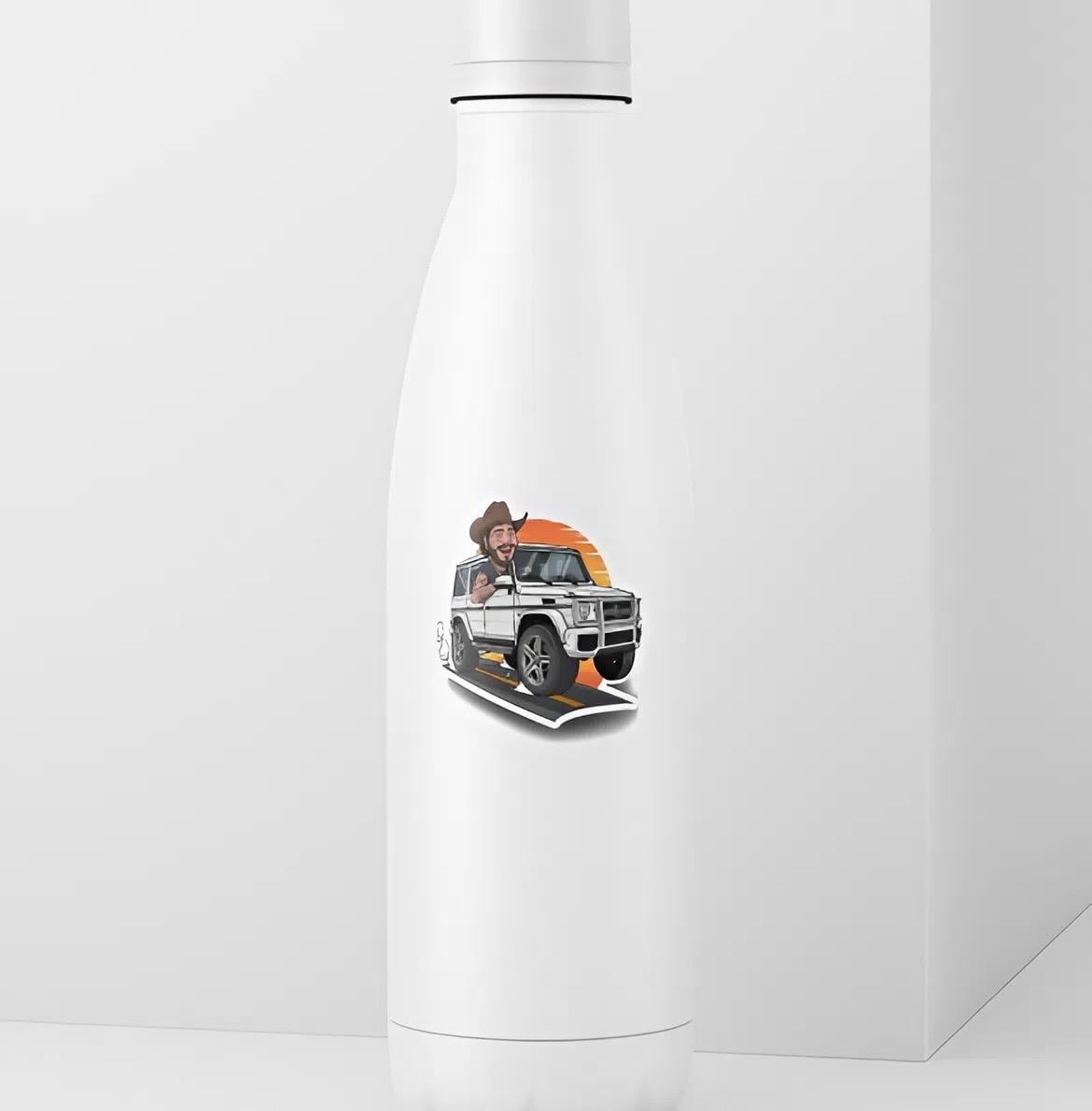 This captivating decal features Post Malone, with his signature tattoos and infectious smile, happily driving a sleek white Mercedes G-Wagon, all while sporting a classic cowboy hat. It perfectly captures his unique blend of urban cool, Western charm, and pop star charisma, making it the ideal accessory for any Post Malone fan, G-Wagon enthusiast, or anyone who appreciates iconic celebrity style and distinctive art.