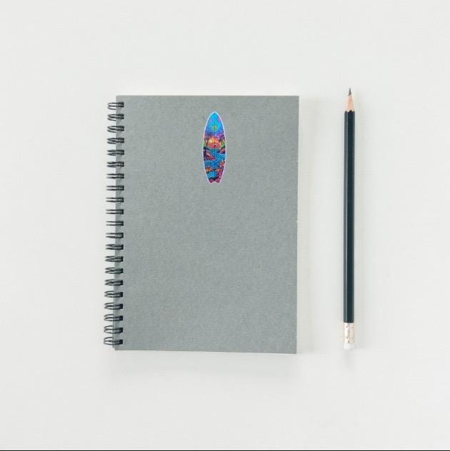 Ride a wave of color with this stunning psychedelic surfboard sticker! Features a vibrant, trippy tropical landscape.
