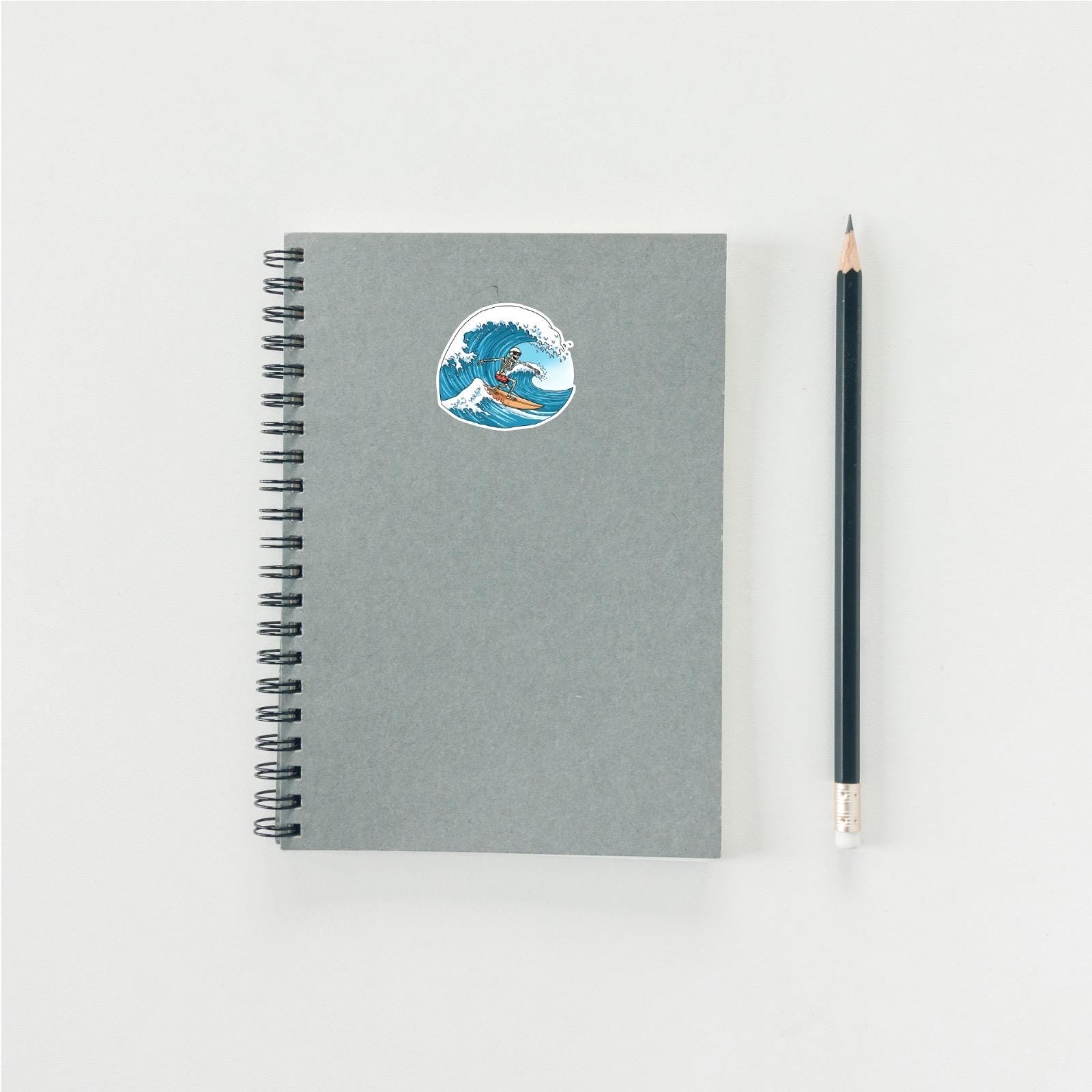 Vibrant Colors: The rich blues of the ocean wave and the detail on the skeleton make this sticker truly pop.