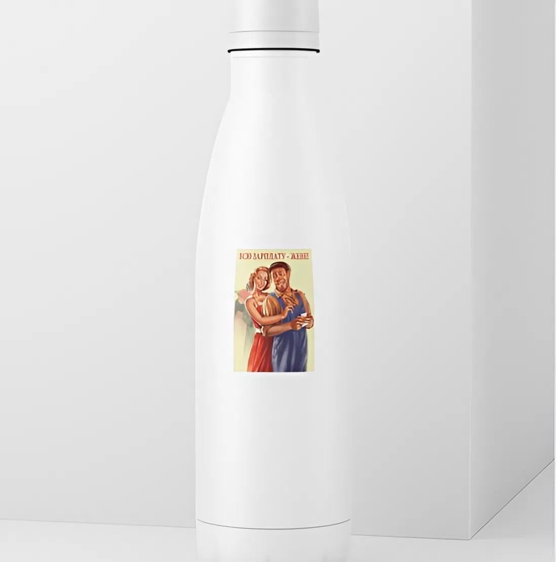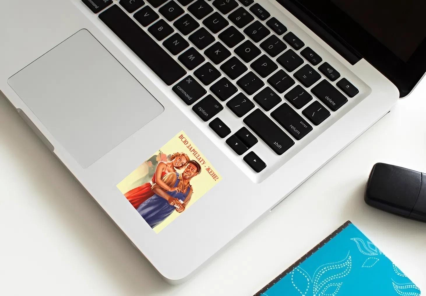 This compelling decal features a detailed print of a classic Soviet-era poster, depicting a smiling worker handing his full paycheck to his equally happy wife, with the Russian phrase "ВСЮ ЗАРПЛАТУ - ЖЕНЕ!" (The whole salary to the wife!) at the top. It offers a unique glimpse into the historical social commentary of the time, perfect for collectors, history enthusiasts, art students, or anyone who appreciates thought-provoking retro designs.
