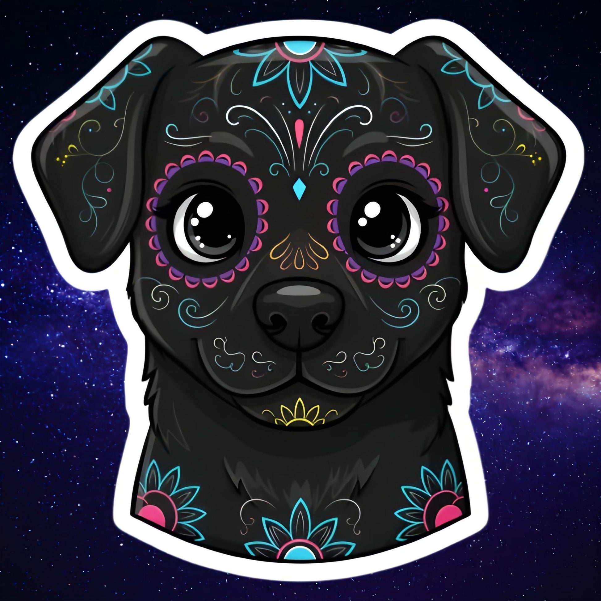 This captivating decal features an adorable black dog, adorned with intricate and colorful sugar skull face paint, reminiscent of the festive Calaveras of Día de los Muertos. Its bright, cheerful aesthetic perfectly captures the joyful and commemorative spirit of the Day of the Dead and traditional Mexican folk art, blended with the undeniable charm of a beloved pet. It's the perfect accessory for dog owners, lovers of unique cultural art, vibrant designs, or anyone who cherishes their pets and appreciates meaningful art.